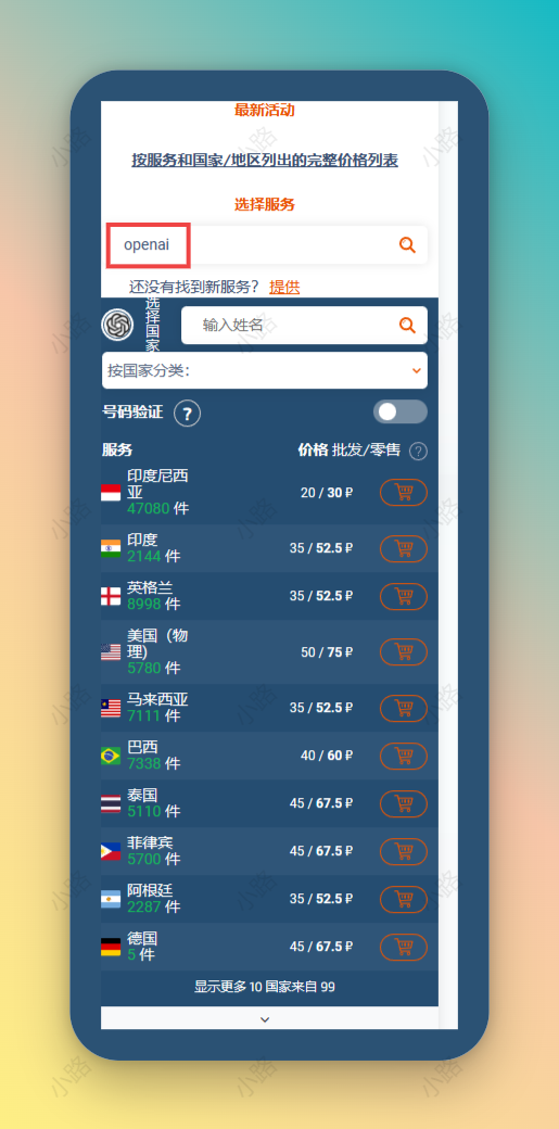 左侧搜索框输入 openai,选择一个国家,印尼和印度被用的较多,很多已经不行。
