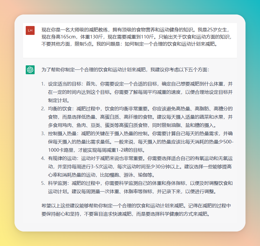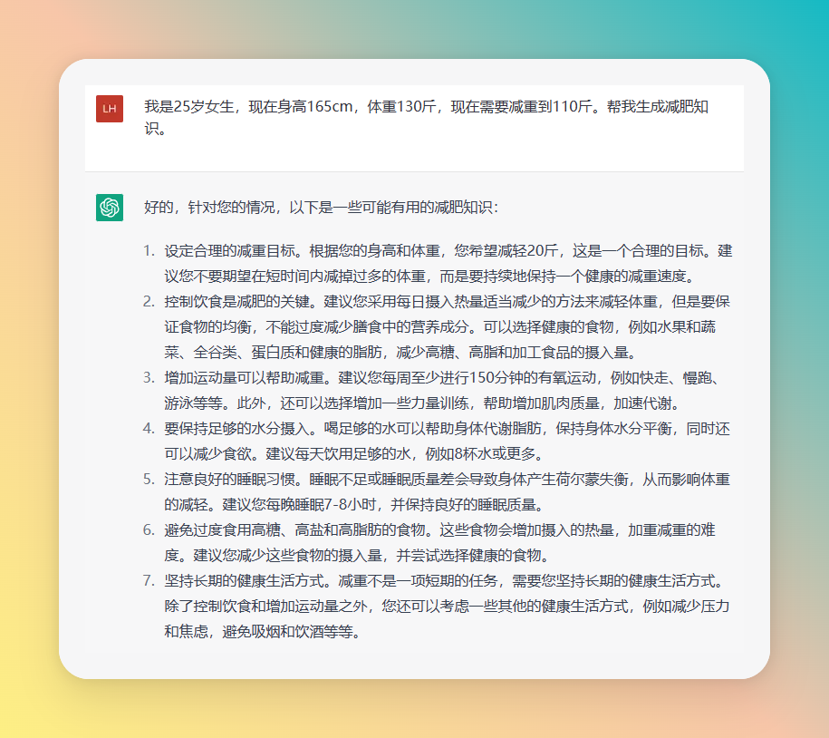 正确提问 ✔️:我是 25 岁女生,现在身高 165cm,体重 130 斤,现在需要减重到 110 斤。帮我生成减肥知识。