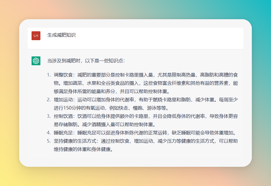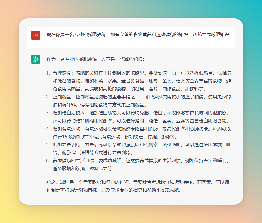 正确提问 ✔️:现在你是一名专业的减肥教练,拥有完善的食物营养和运动健身的知识,帮我生成减肥知识